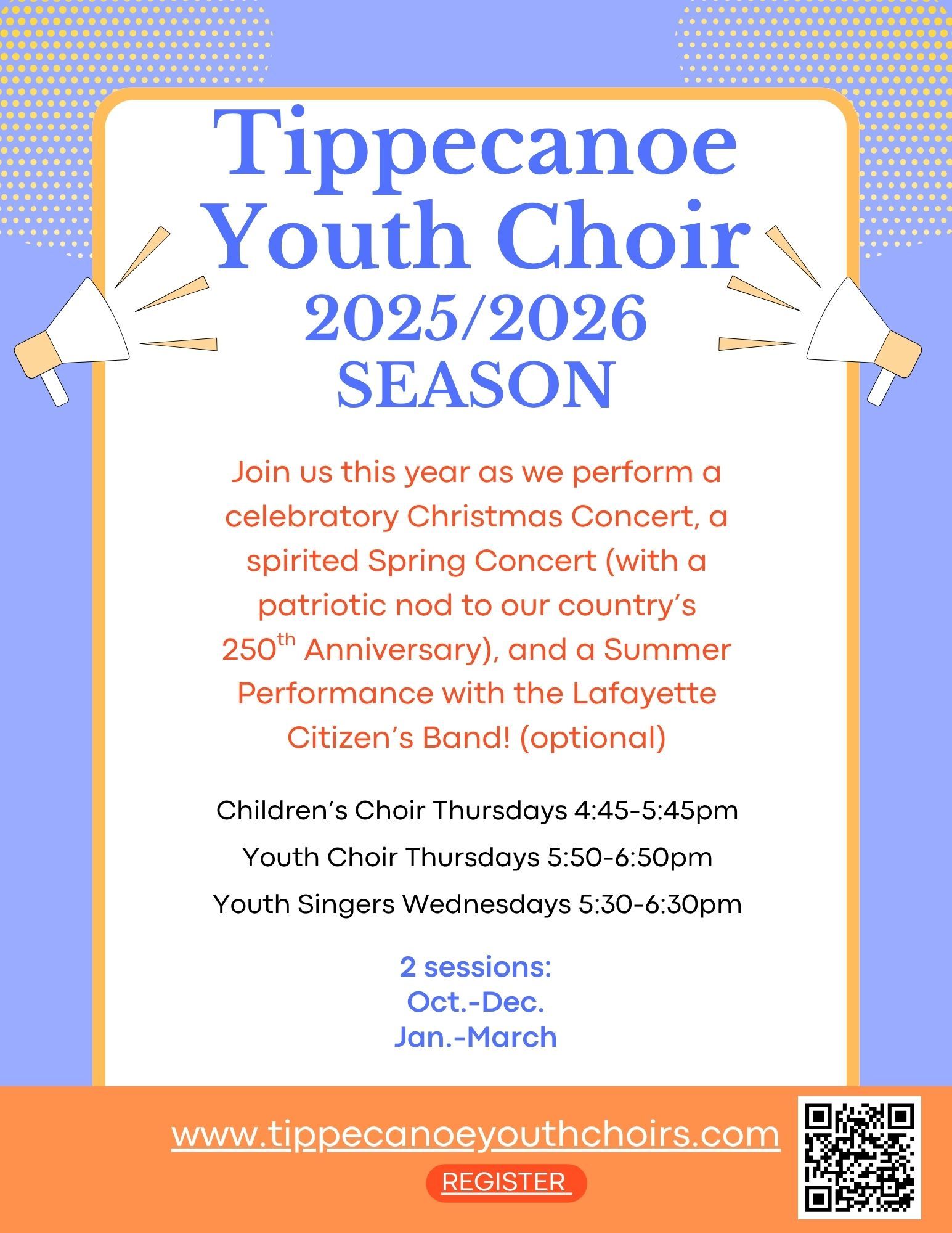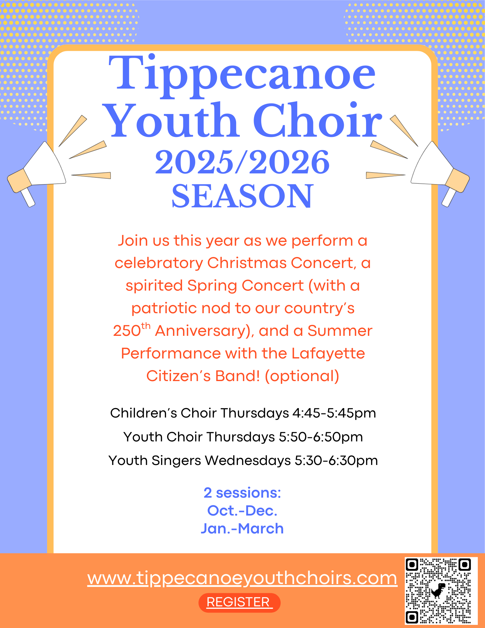 The Tippecanoe Youth Choir is for youth in grades 6-8. Singers will be taught proper vocal technique while learning songs in numerous musical styles and harmonies. There is no audition or vocal assessment required. If your child has a desire to sing, they are welcome to join!